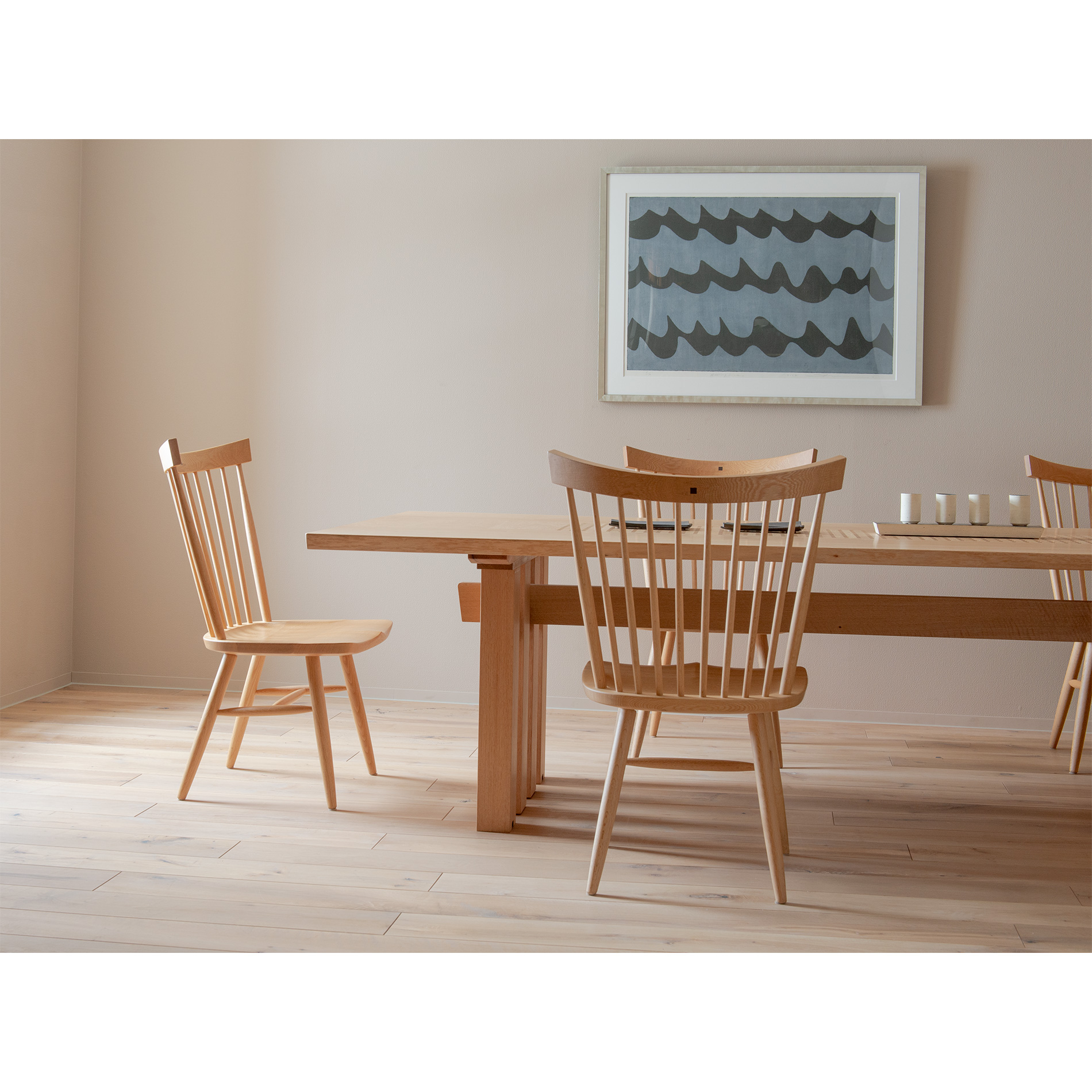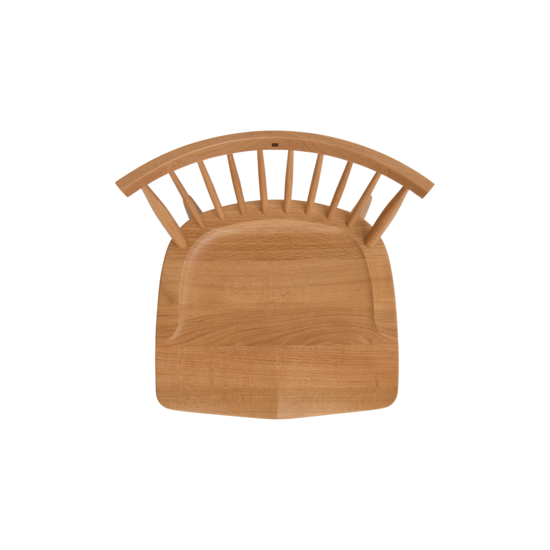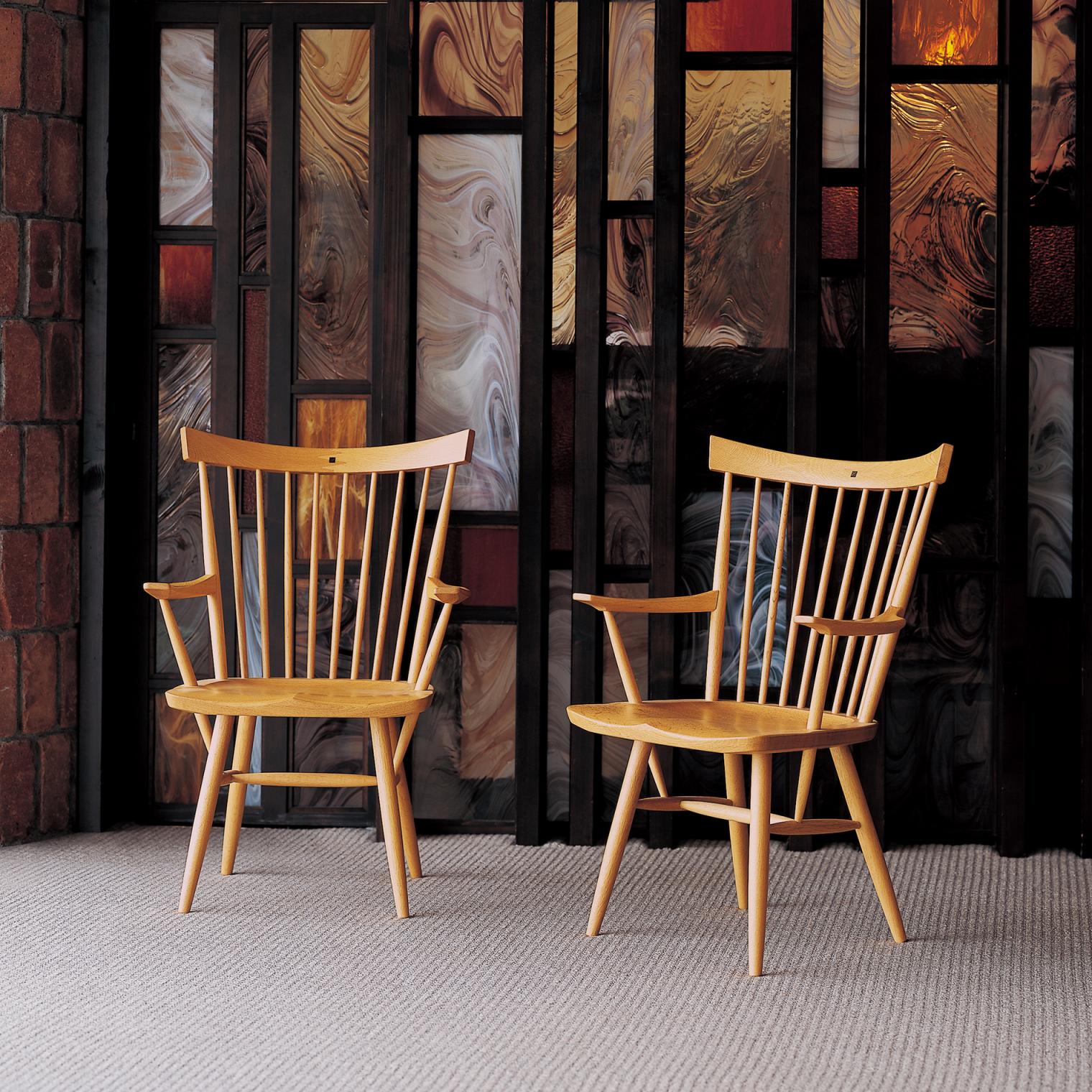 Riki Windsor is a traditional English Windsor chair that has been redesigned to suit the Japanese physique and living environment from Riki Watanabe's particular perspective. The chair is the result of a sophisticated fusion of beauty and technology, such as the back spokes of varying thickness, the frame penetrating through the seat from the arm to the leg beam, etc.
