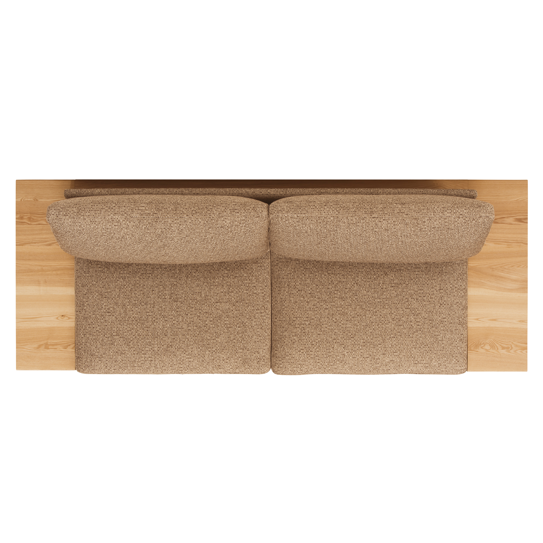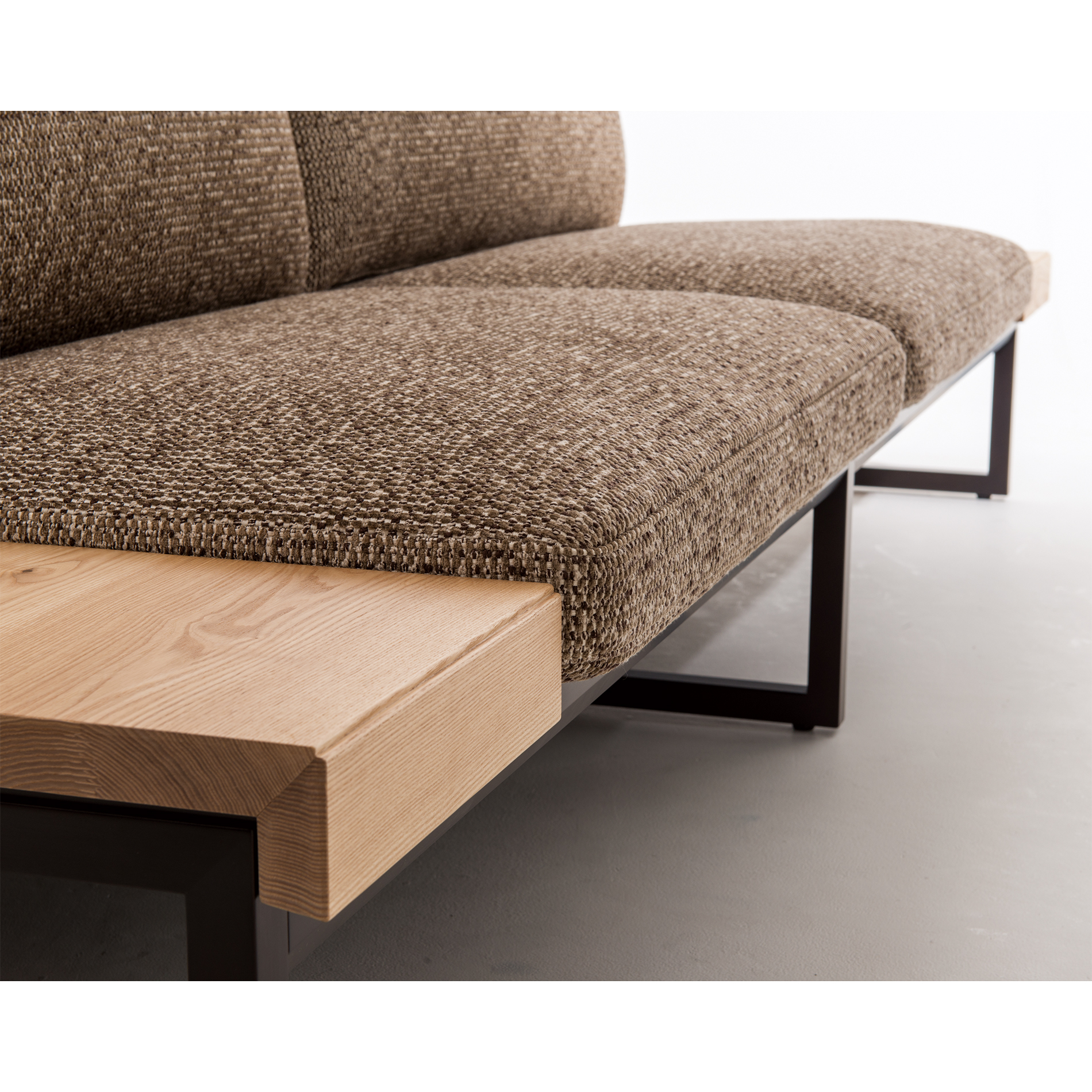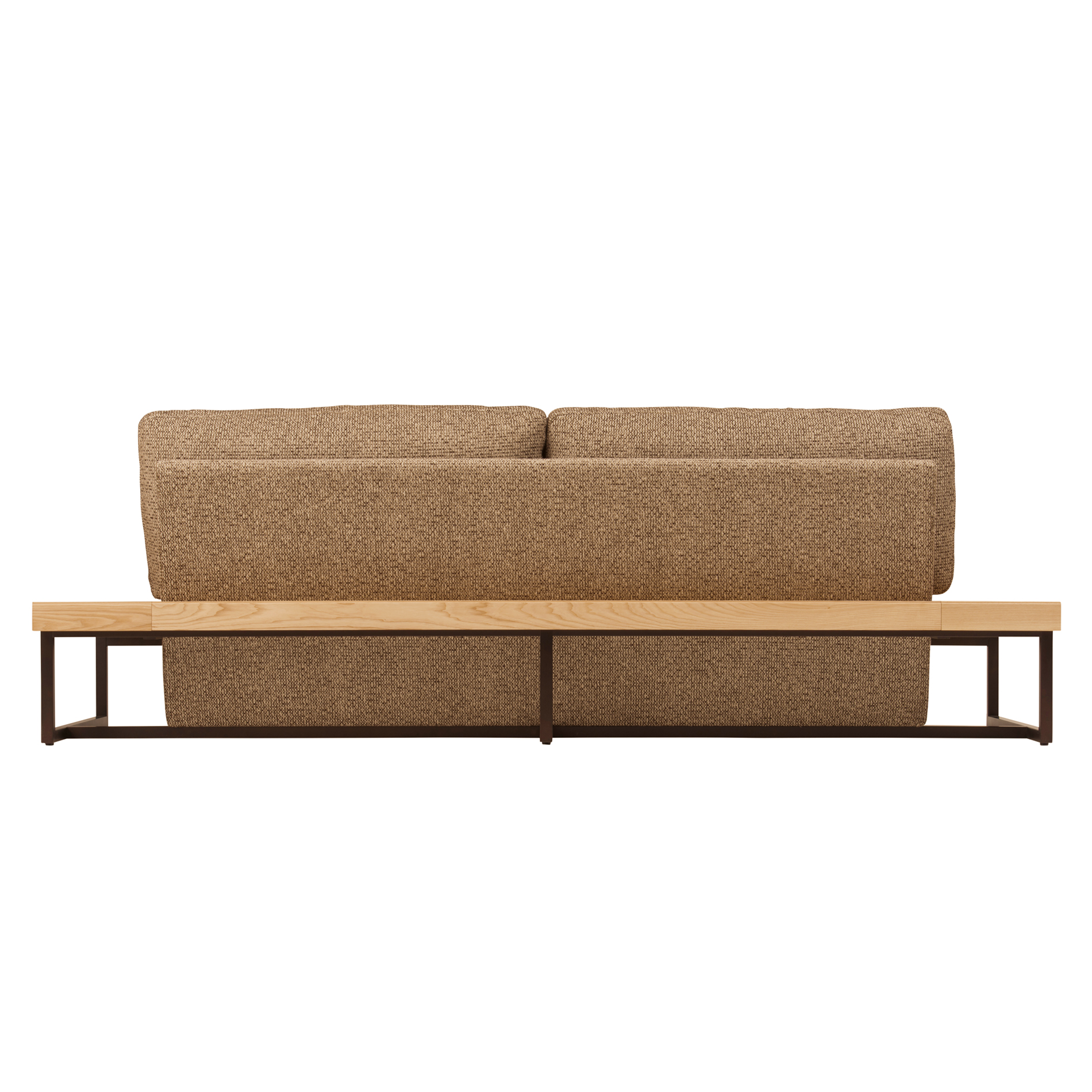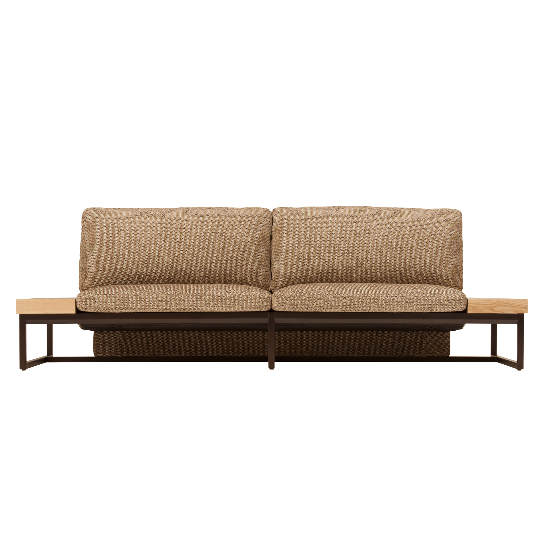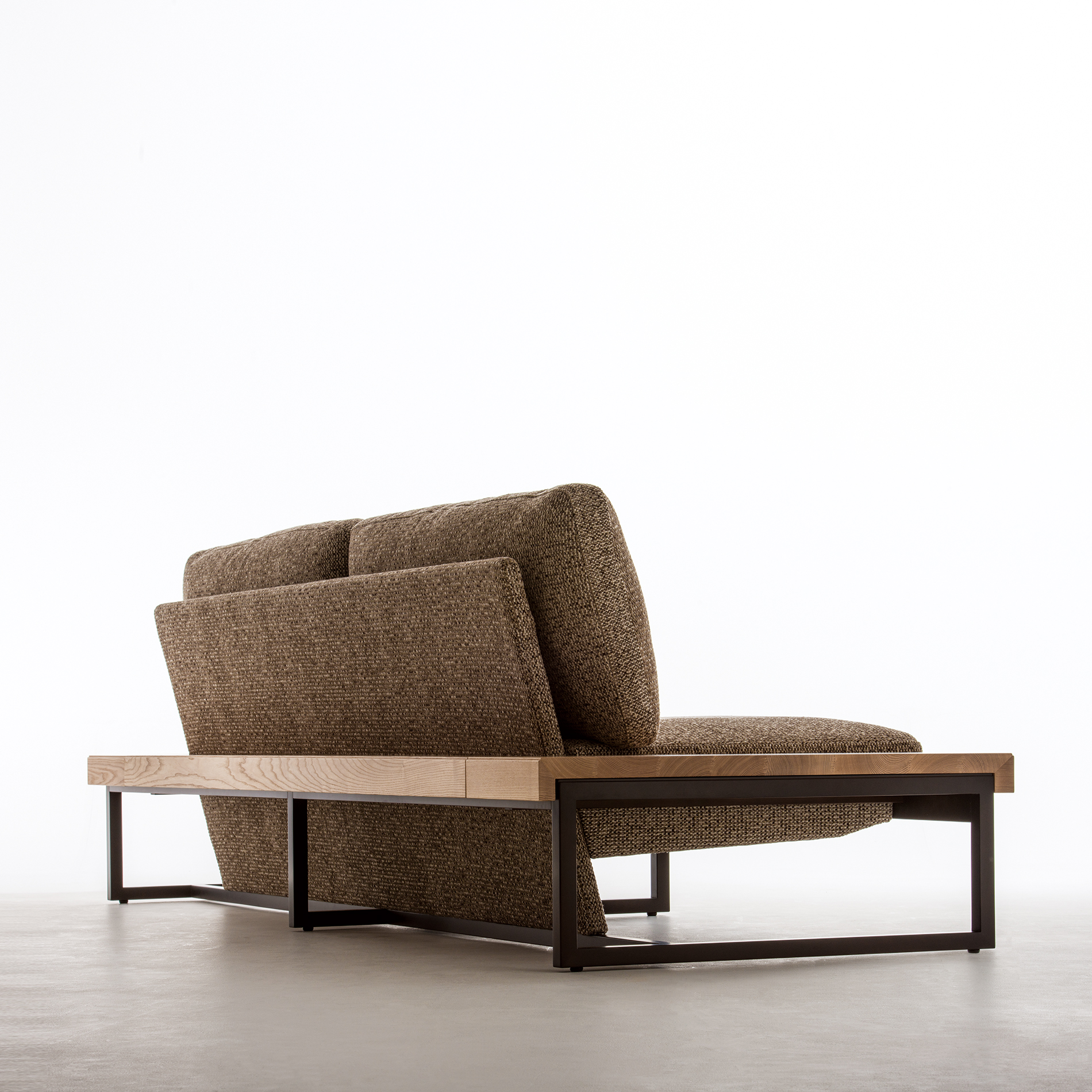 The base frame is thin and colored darker, which makes the seat part look light and floating. The arm board is made of solid-wood pieces in different sizes to create individuality.