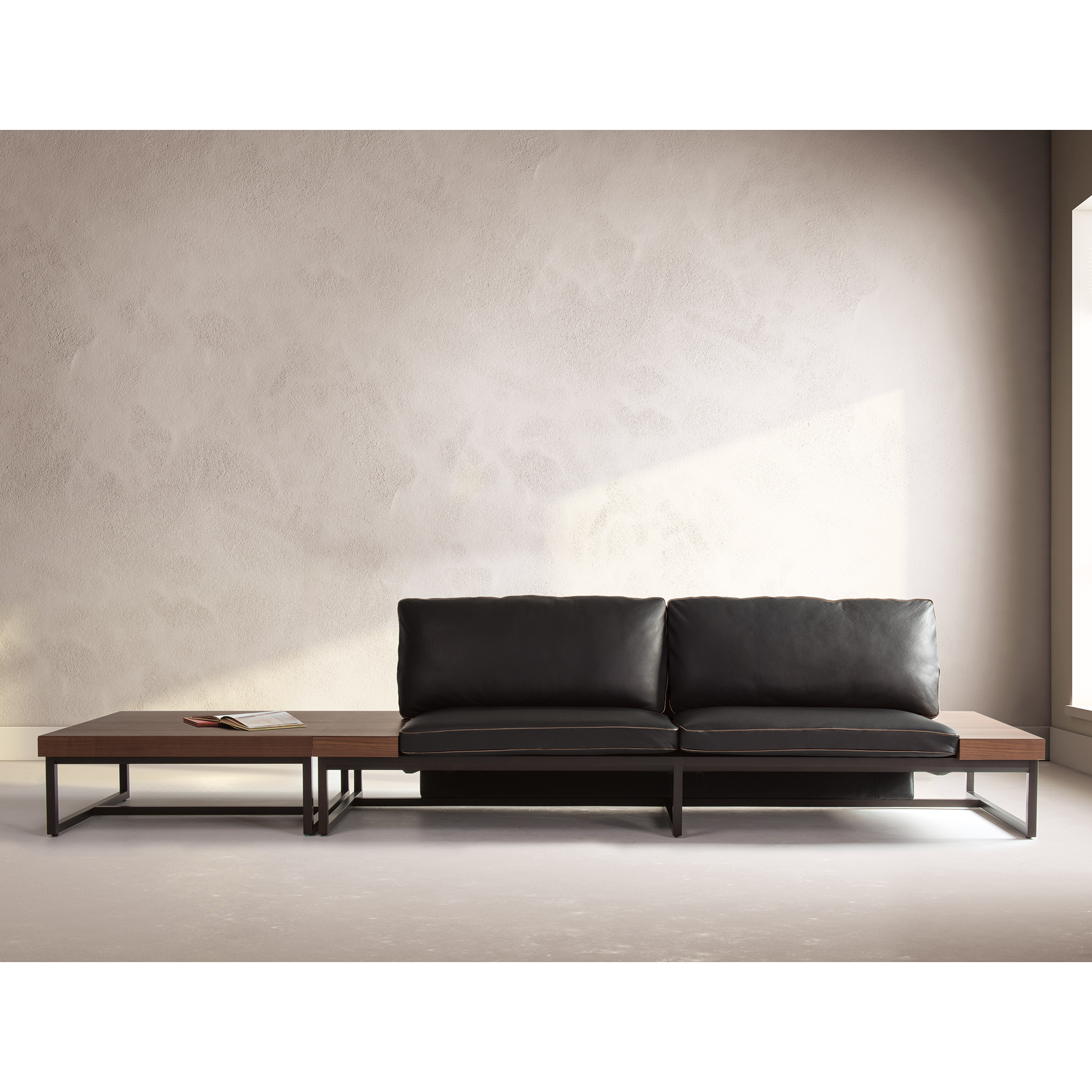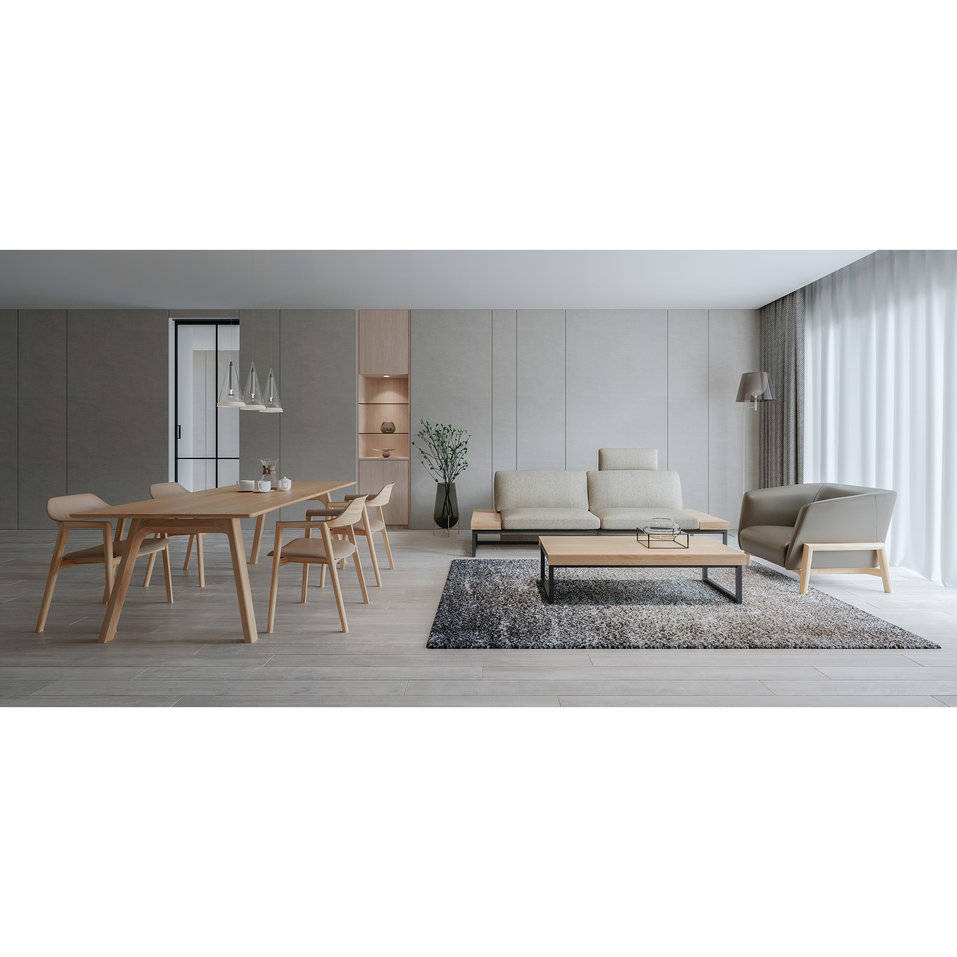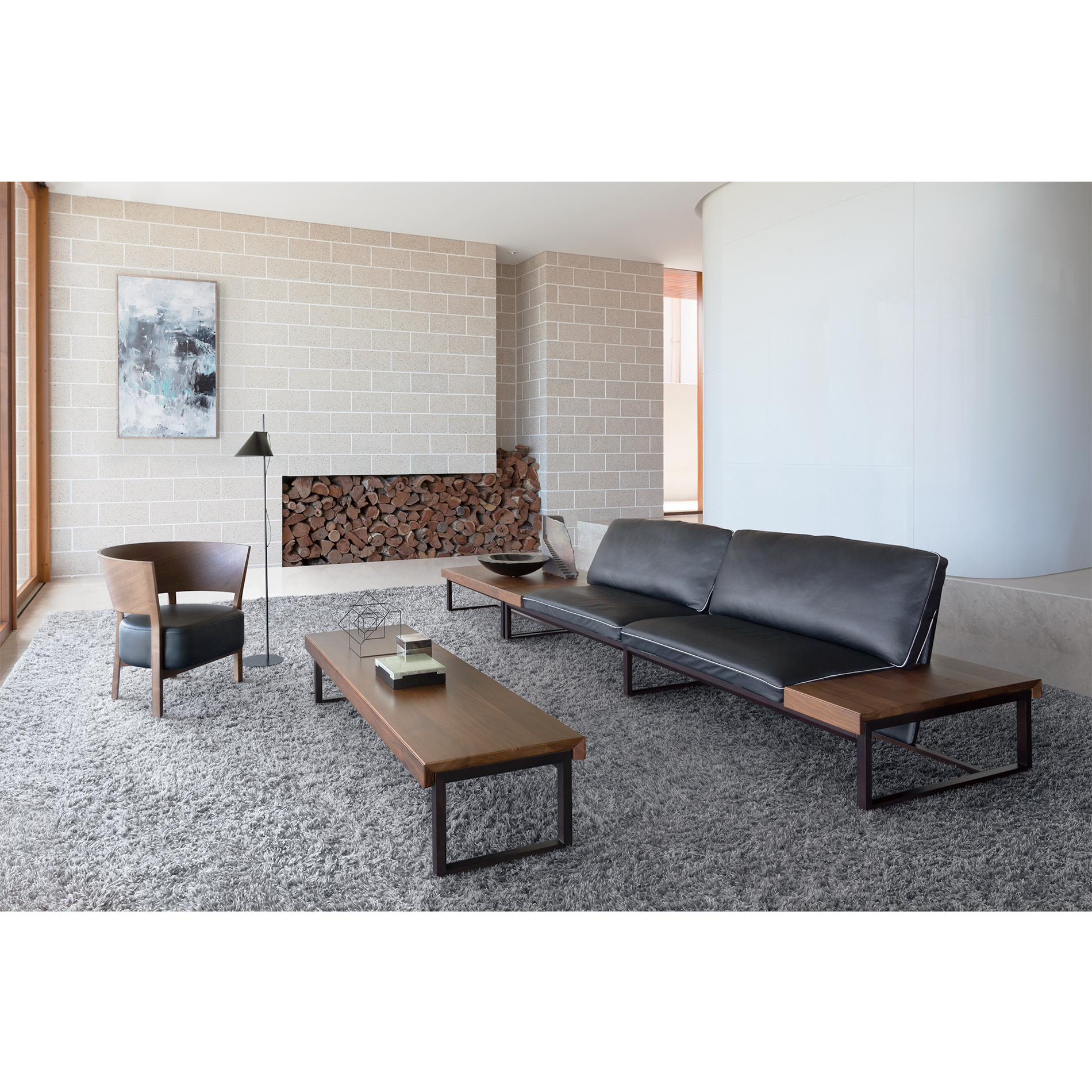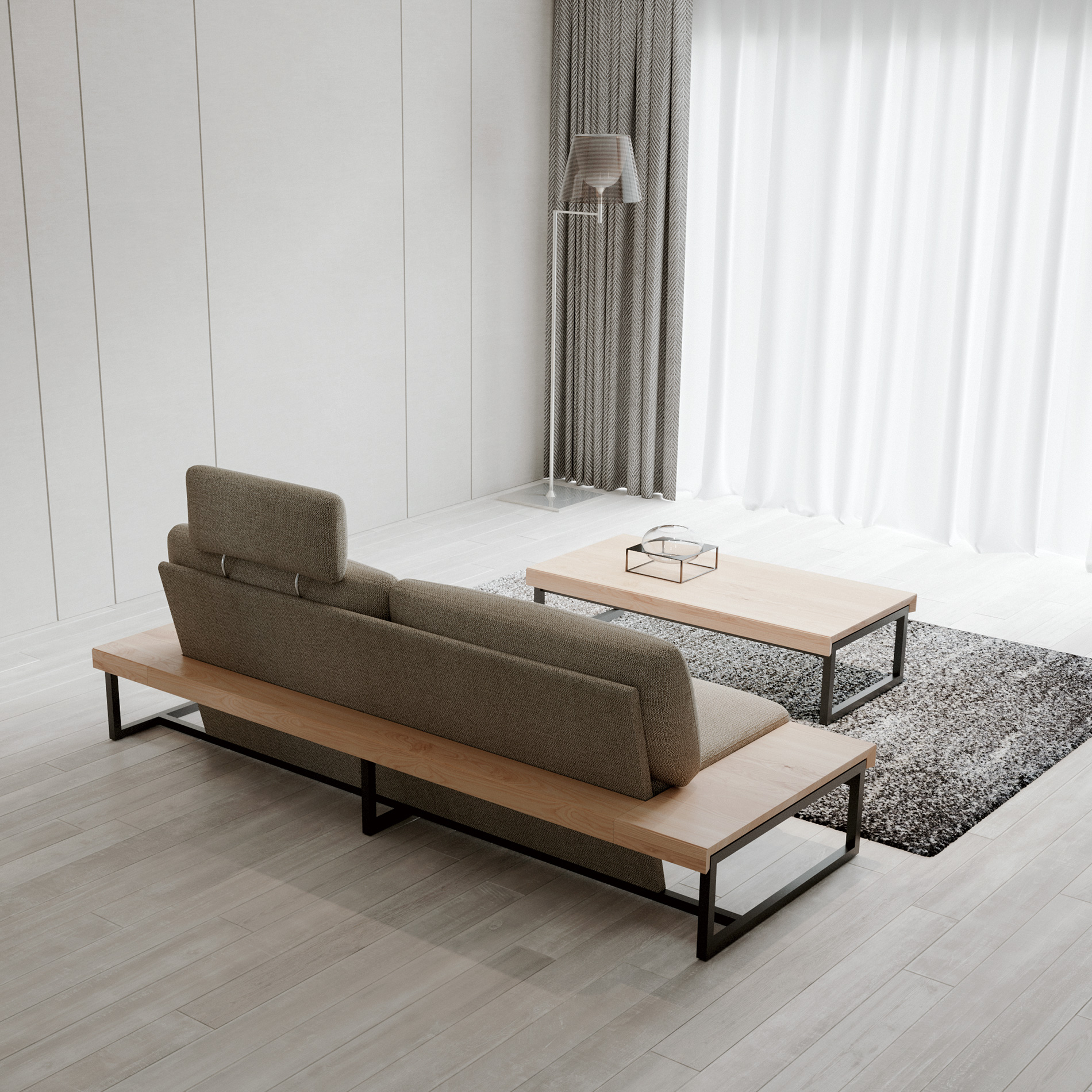 The base frame is thin and colored darker, which makes the seat part look light and floating. The arm board is made of solid-wood pieces in different sizes to create individuality.