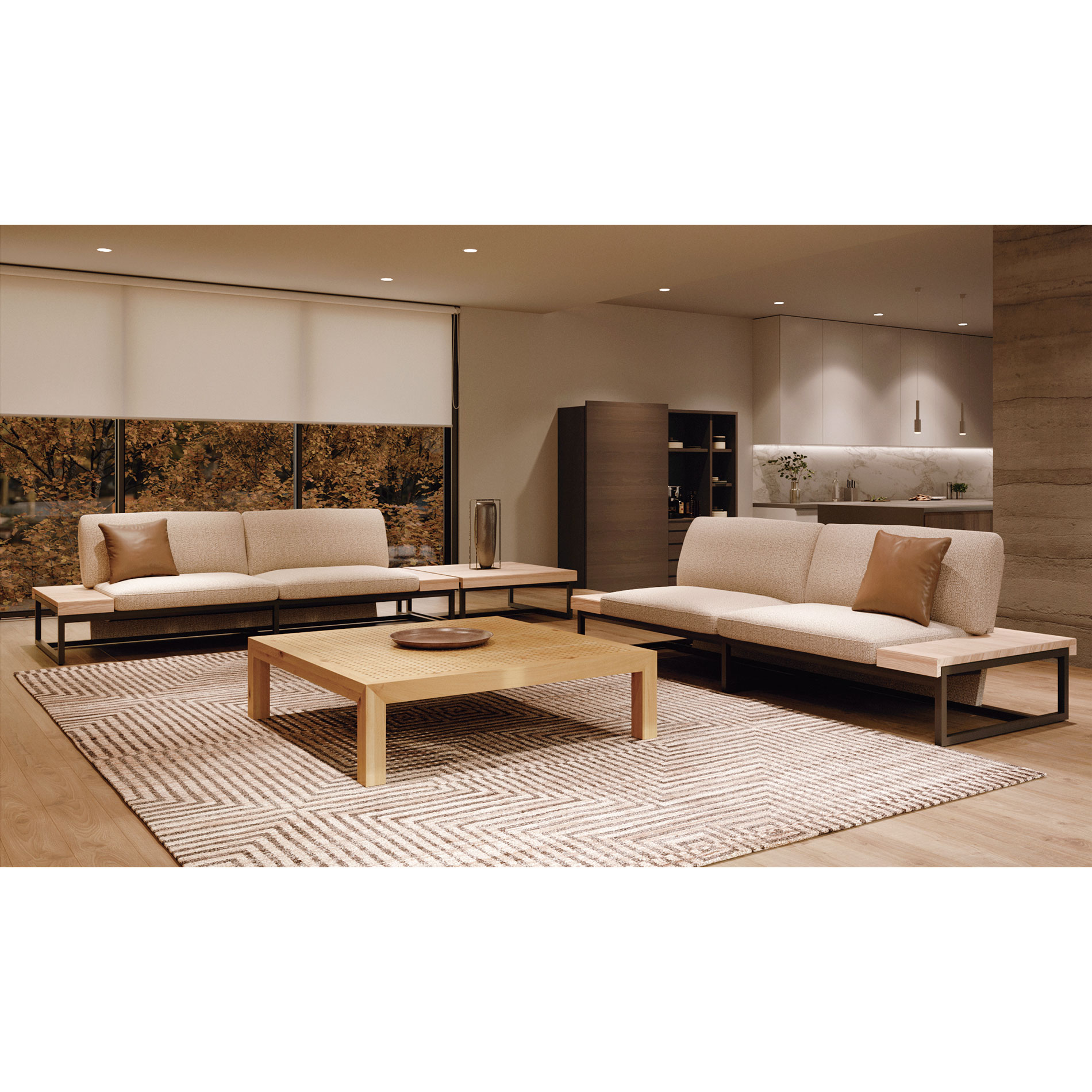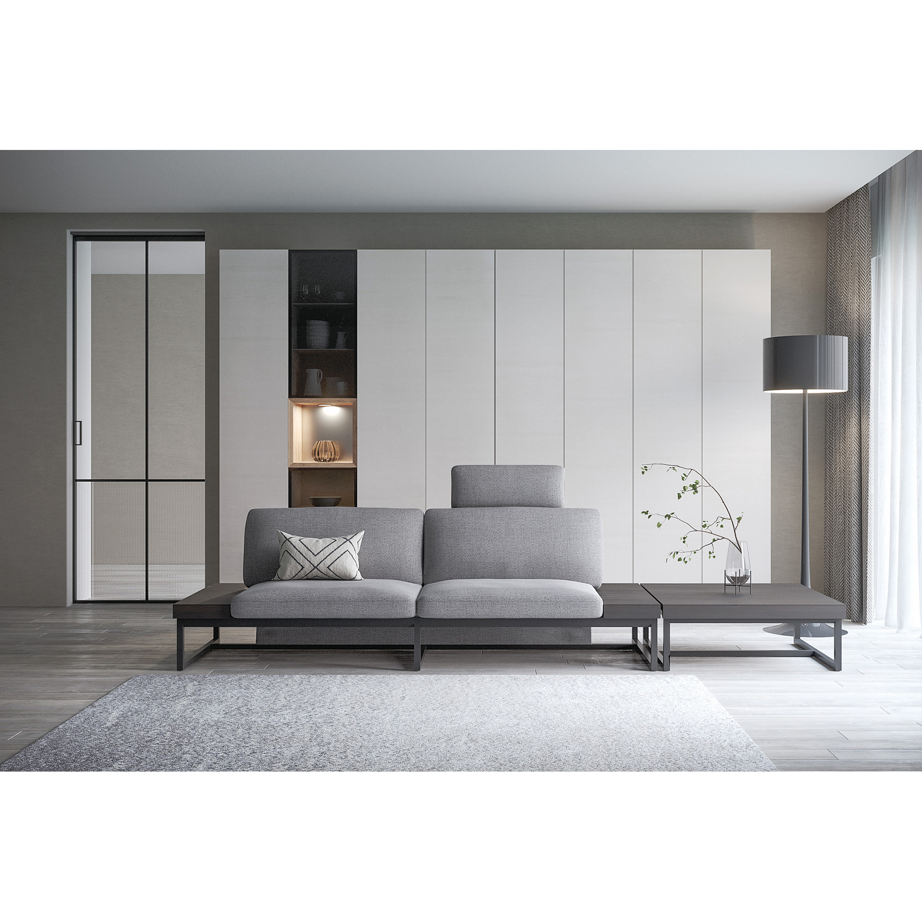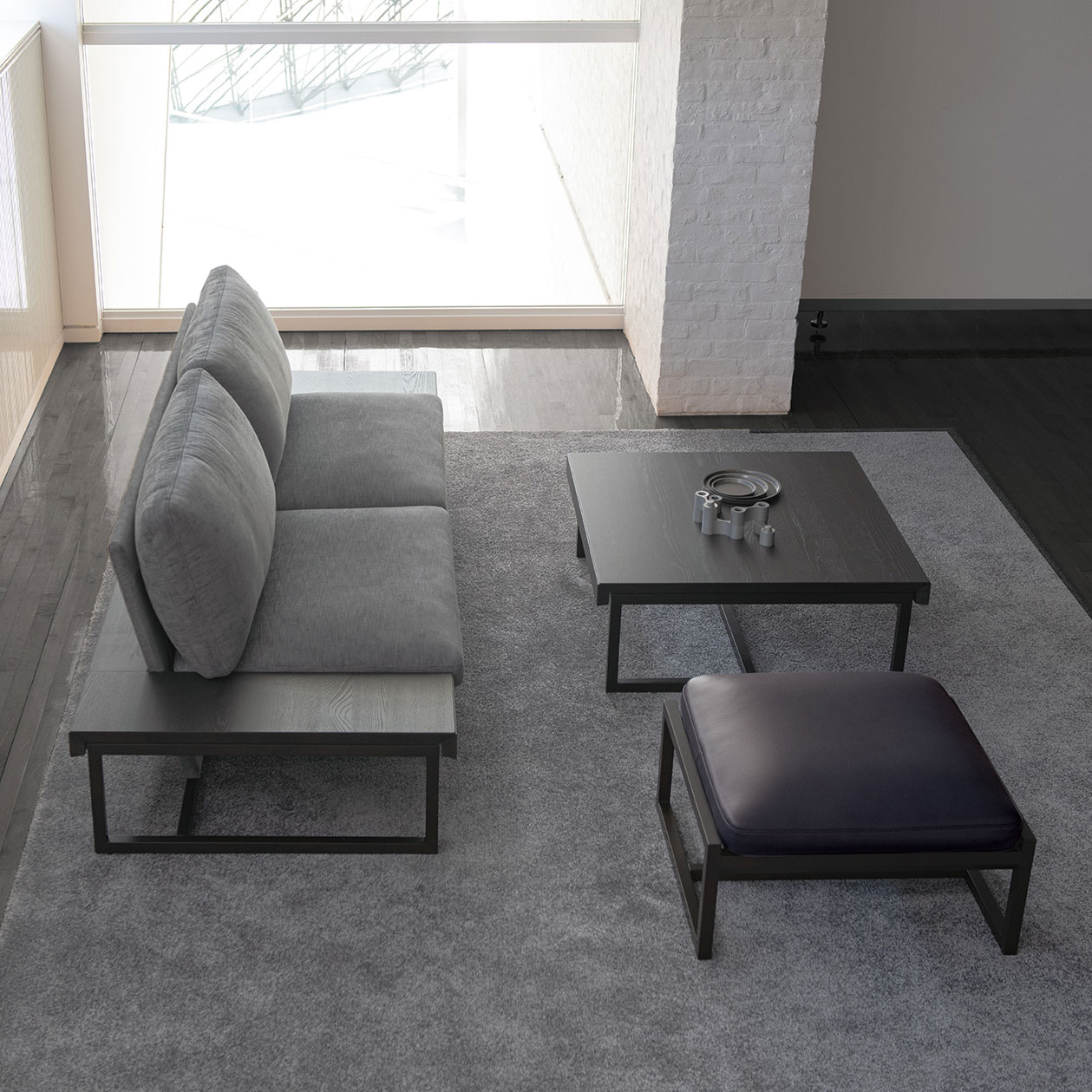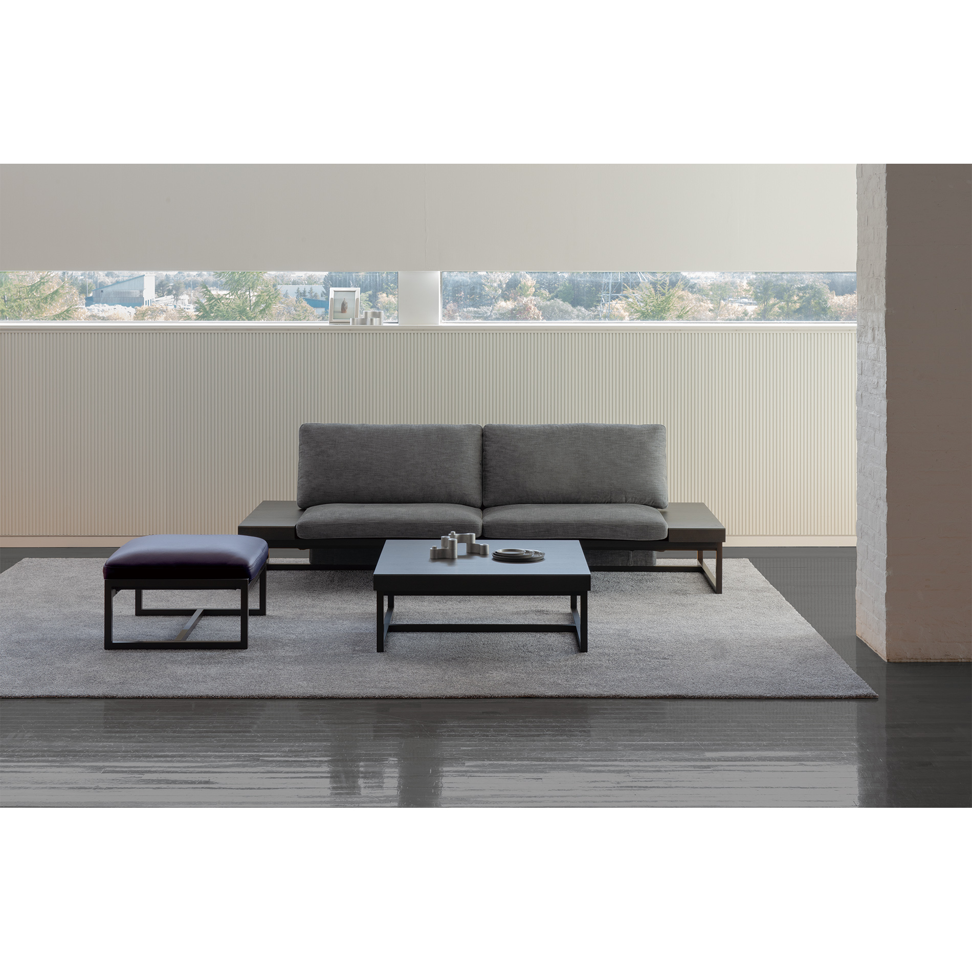 The base frame is thin and colored darker, which makes the seat part look light and floating. The arm board is made of solid-wood pieces in different sizes to create individuality.